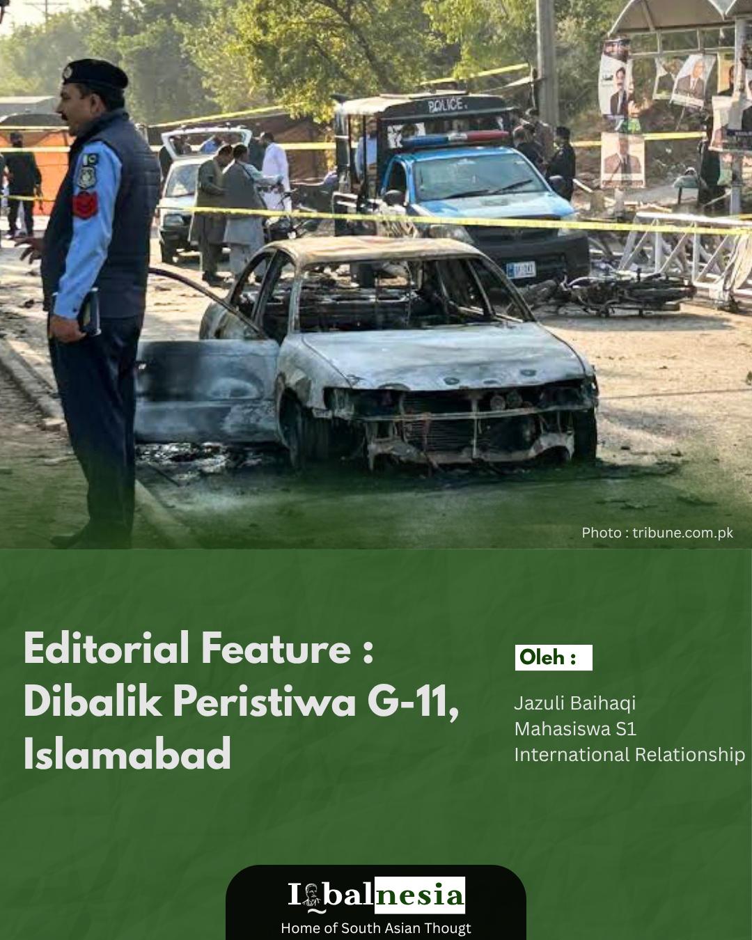 Hari Selasa, 11 November 2025 terjadi sebuah ledakan yang disebabkan oleh bomb bunuh diri yang menargetkan kantor Peradilan setempat, tepatnya di sektor G-11 Islamabad, Pakistan. Meskipun belum ada pihak yang mengklaim bertanggung jawab atas insiden tersebut, Perdana Menteri Pakistan Shehbaz Sharif mengutuk serangan tersebut, melabelinya sebagai serangan teroris pengecut yang didalangi oleh kelompok teroris yang didukung oleh India. Meski demikian investigasi oleh pihak berwajib sedang dilakukan, untuk mencari bukti adanya keterkaitan Afghanistan ataupun India.